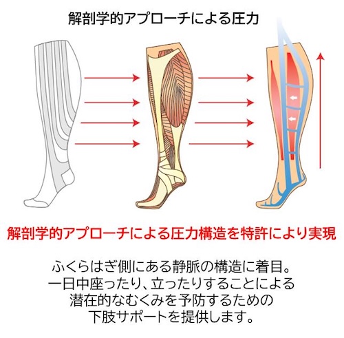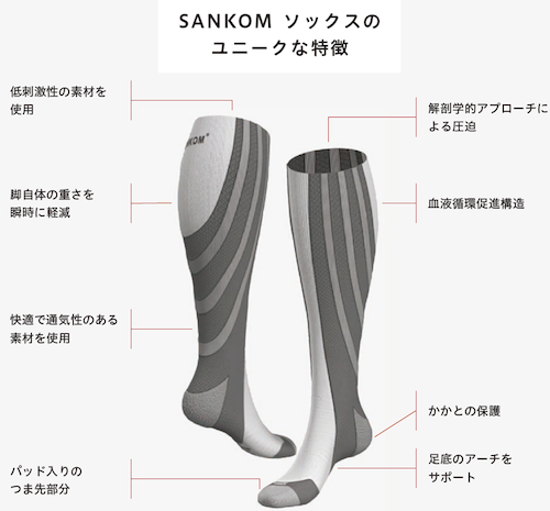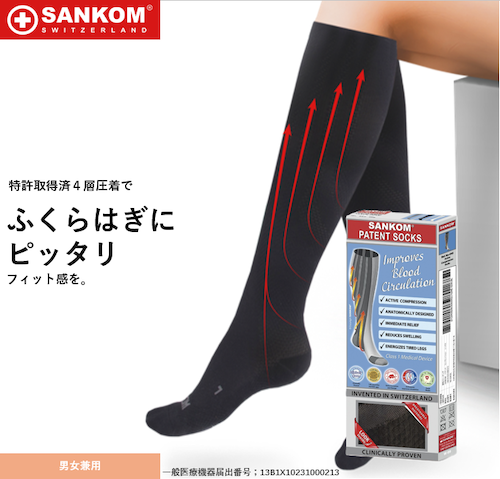 現在はSANKOMブランドで弾性ソックスやストッキングの開発、製造、販売を行っています。